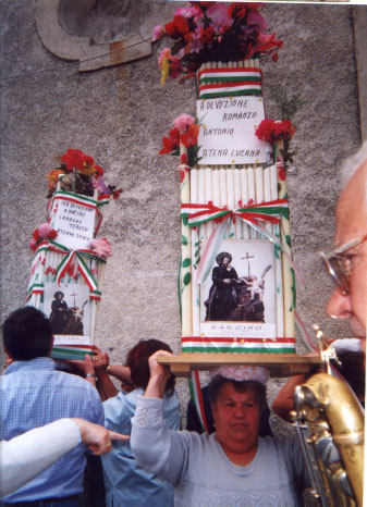 sulla testa. E ancora c'è qualche donna che per devozione o perchè chiede una grazia al Santo che fa tutta la processione scalza Another popular feast day in Atena Lucana is the feast day of San Ciro, which is celebrated the 3rd Sunday of May. The women, to show their devotion carry these huge pyramids of candles on their heads in a procession. Many of them go barefoot as well to show their devotion or to ask for a healing from the Saint. This sort of procession can only be found today in small communities in the southern parts of Italy. |