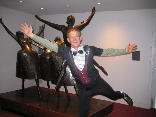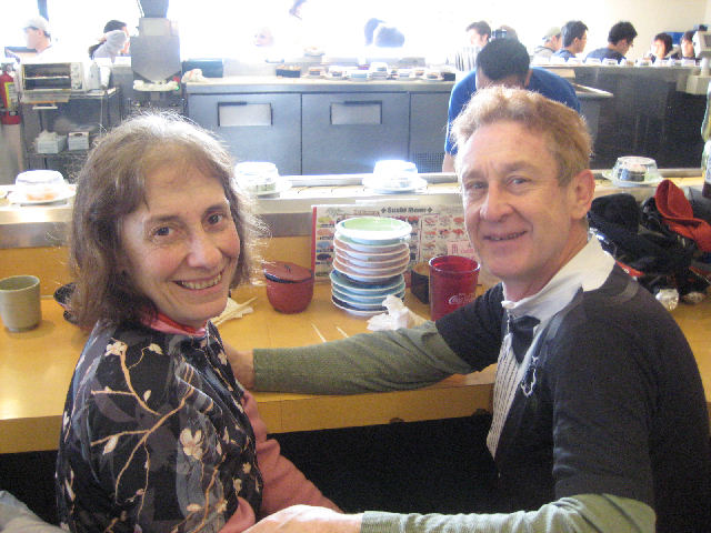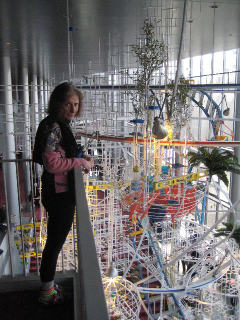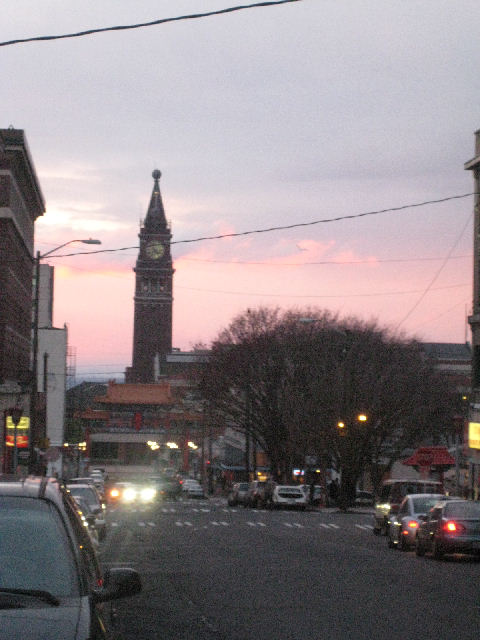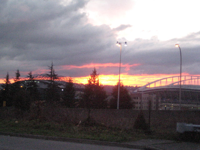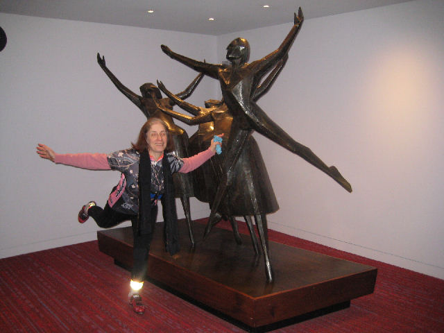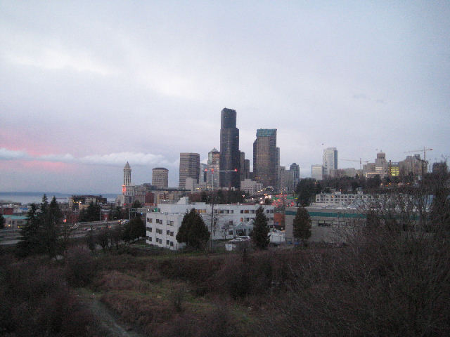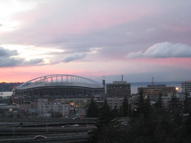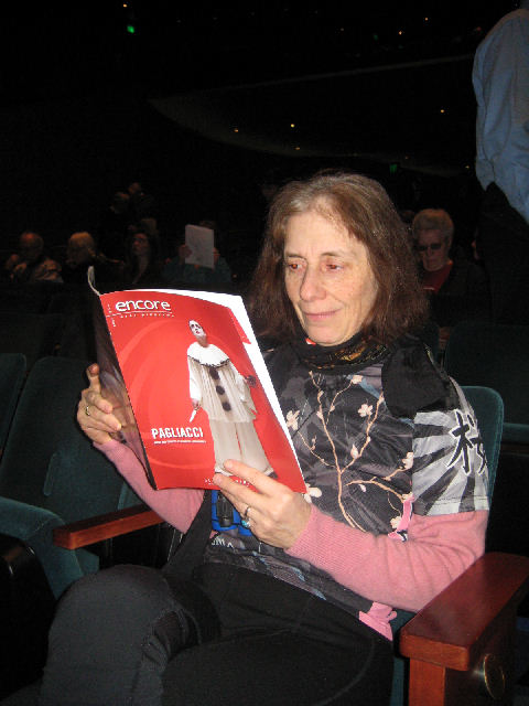 weather report for January 20th; cold, gradual clearing. A high of 40 degrees.The ride downtown was uneventful but a headwind slowed Mimi down. We had Sushi for lunch ![]() After lunch, we still had an hour before we needed to be at the opera, so we went by the Experience Music Project ![]() In the opera house long before start time, we took a look around. We danced with the statues ![]() ![]() Examined the sculptures ![]() and then went in and sat down ![]() Donald looked so official that people thought he worked there ![]() The opera, Pagliacci, was wonderful, we ate chocolate and Donald cried and then we had to ride home. It was getting dark, and there was a lovely sunset This is the Smith tower, which was the tallest building in Seattle for many years ![]() The sun caused a fiery glow in the west ![]() which then turned pink ![]() A last view of downtown. You can see the Smith tower, with a pink square of sun on it dwarfed on the left ![]() |